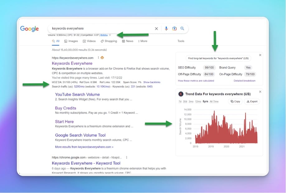 What's cool about this tool is that as I already mentioned it's a Chrome Extension which means it shows all the relevant information on the SERPs themselfes. This makes it super easy to use by beginners who don't need to learn a new user interface.