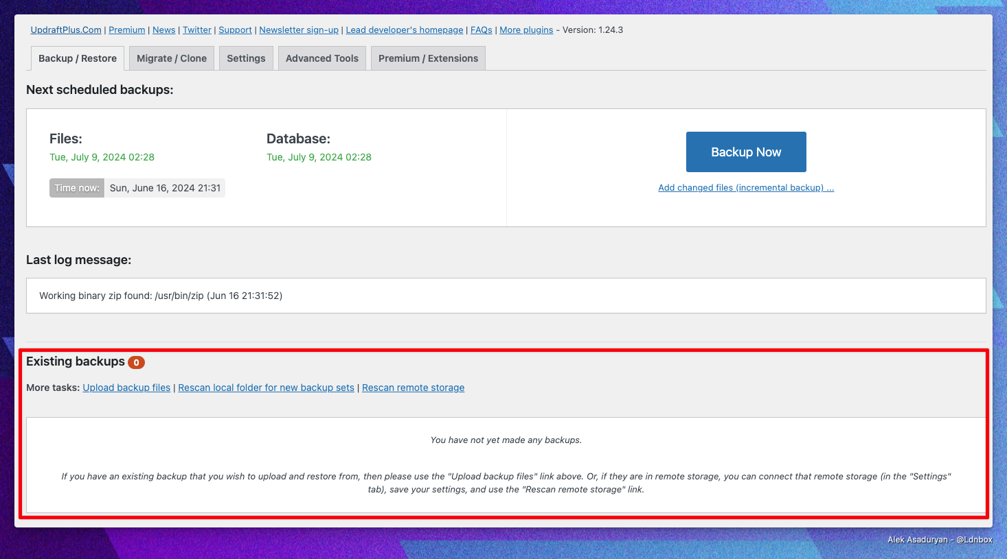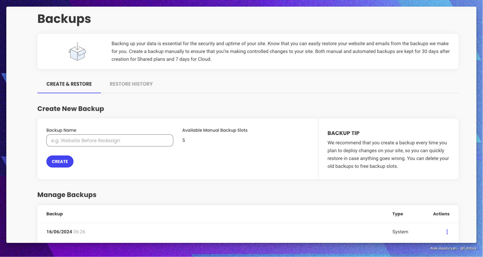 - Access Existing Backups: In the “Existing Backups” tab, you will see a list of your backups.