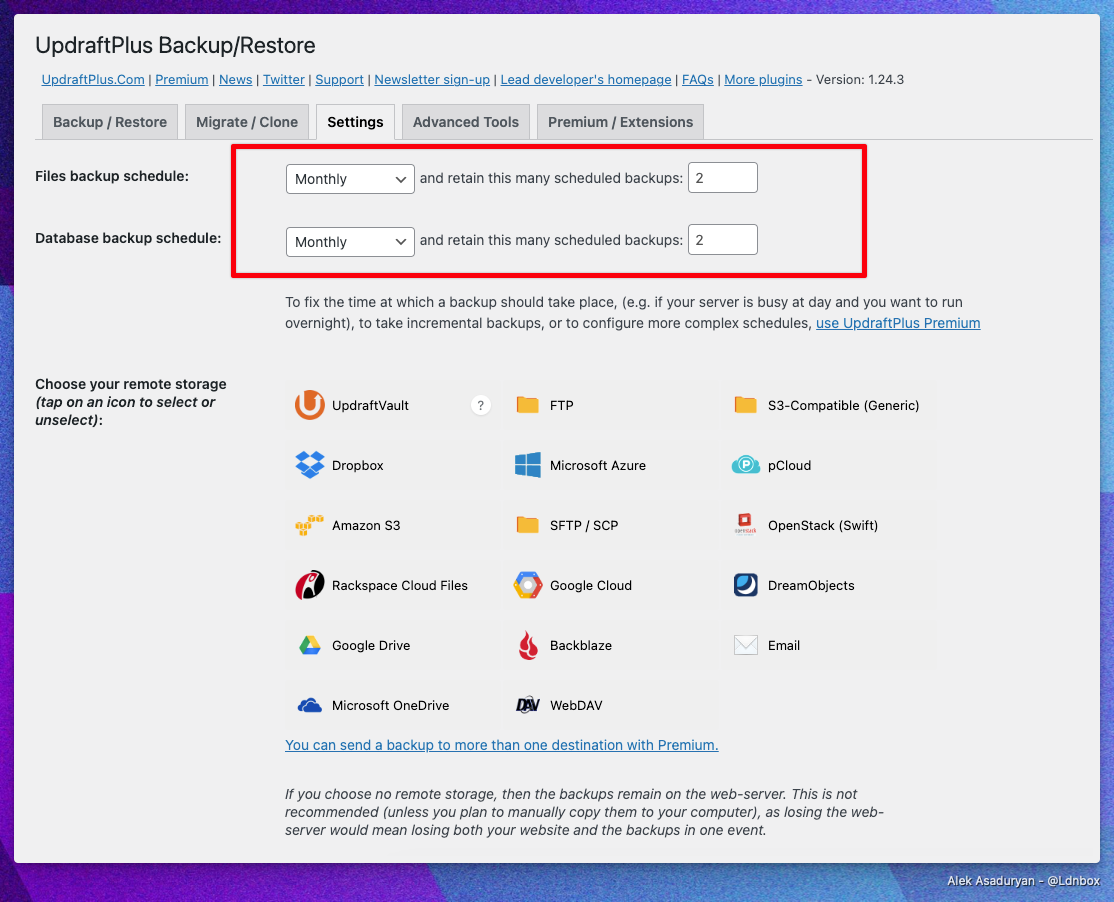 Set the “Files backup schedule” and “Database backup schedule” to your preferred intervals (e.g., daily, weekly).