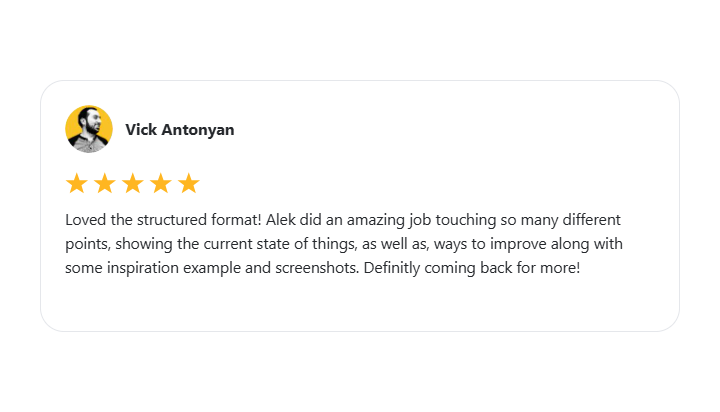 You will receive a Notion document with your report with all the areas you can improve on your website, ideas, and tactics to implement some of the changes.